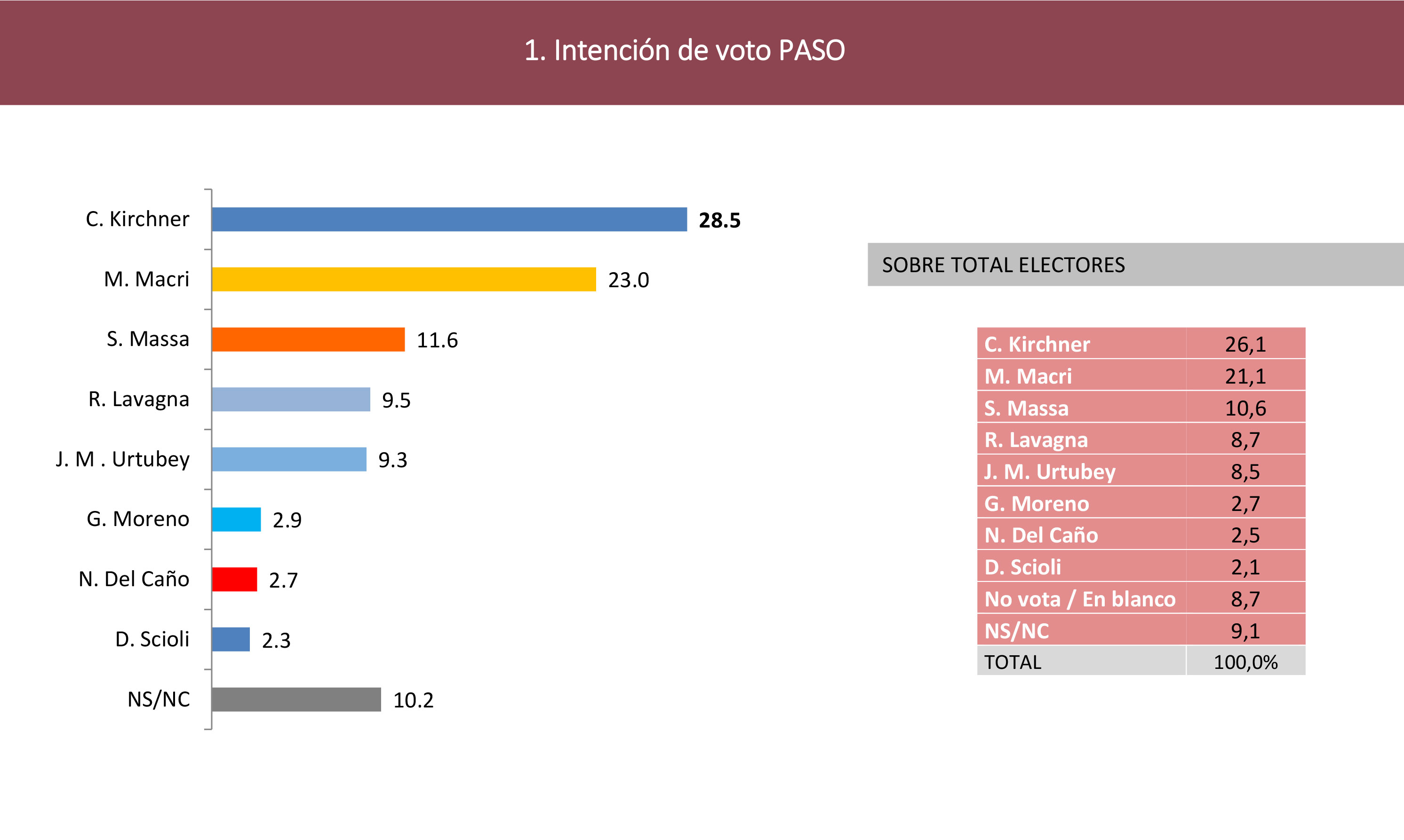 En la distribución del 54,6% de los electores peronistas de escenario de PASO que votaron por otros candidatos del PJ se registra que 2,5% opta por Macri, mientras que 39,7% elige a Lavagna, siendo el 15,9% electores de CFK en las PASO y, curiosamente, 1,7% de electores macristas en las PASO.
