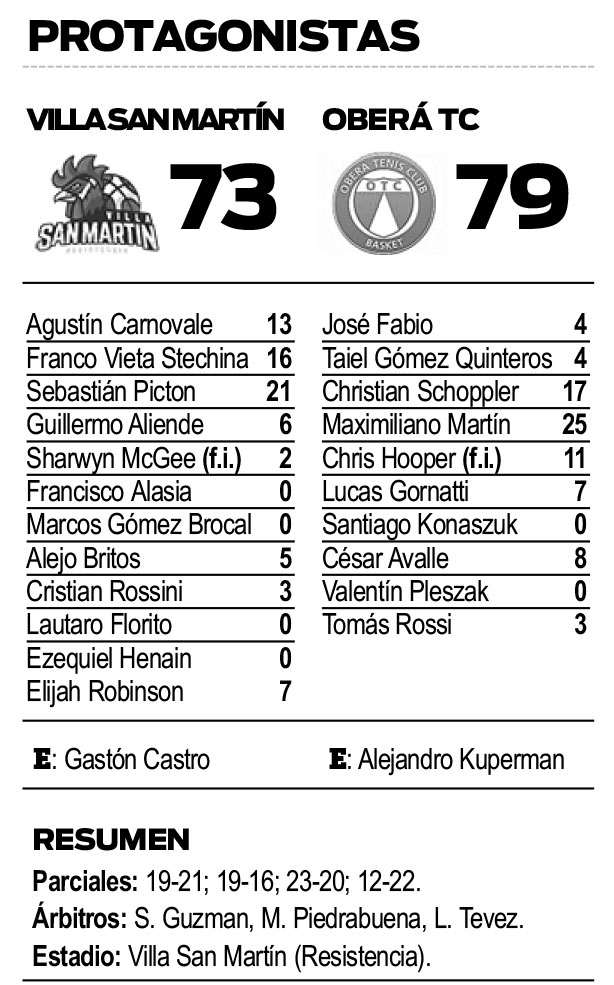 Oberá Tenis Club (OTC) logró la clasificación a los cuartos de final de la Conferencia Norte de la Liga Argentina de Básquet tras vencer a Villa San Martín por 79-73 anoche como visitante. Así las cosas, la serie terminó 3-2 a favor de los misioneros que ahora se las verán con San Isidro, equipo de San Francisco, Córdoba.