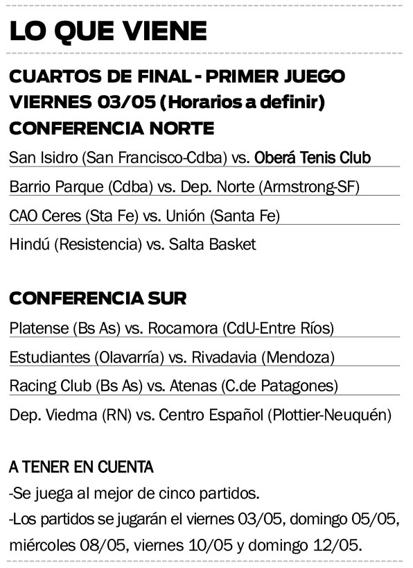 Con las pulsaciones un poco más bajas después del resonante triunfo en tierras chaqueñas, Oberá Tenis Club (OTC) tiene la mirada puesta en lo que se viene: el próximo viernes 3 de mayo enfrentará a San Isidro de San Francisco, Córdoba, por un lugar en semifinales, después de haber dejado afuera al fuerte Villa San Martín en la única serie de la Conferencia Norte que llegó al quinto partido.