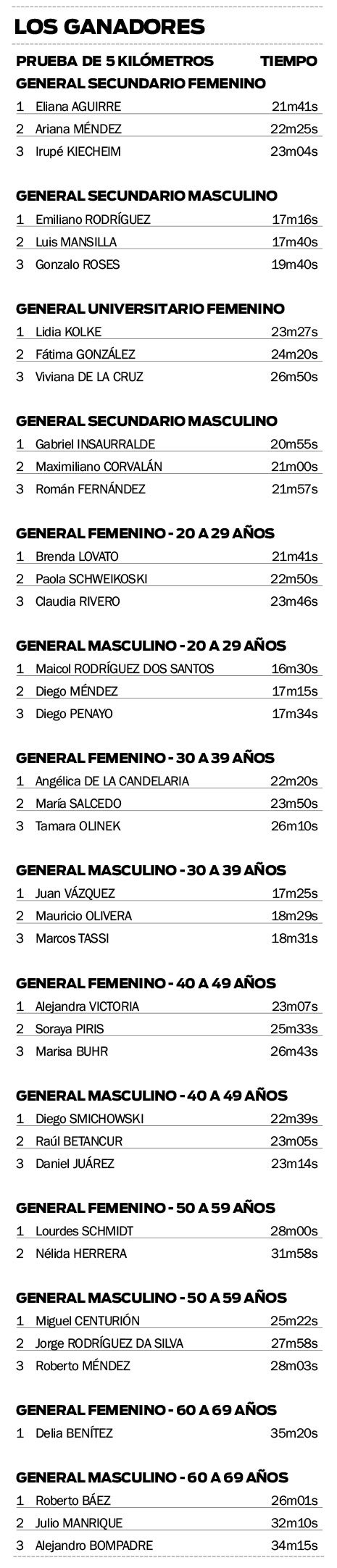 En tanto, entre las mujeres hubo empate a la hora de definir a la más veloz. La montecarlense Brenda Lovato, en la categoría de 20 a 29 años, completó el trayecto de cinco kilómetros en 21m41s, al igual que Eliana Aguirre, vencedora en la divisional reservada para estudiantes secundarios.