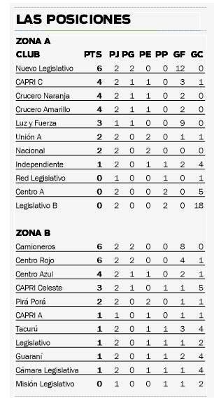 La gran victoria da las vigentes campeonas se construyó gracias al hat-trick de Alejandra Chamorro, los dobletes de Estela Porral y Claudia Verón y los goles de Mirtha Fariña y Karina Ibarra. Luz y Fuerza conforma la Zona A que, después de disputadas dos fechas, tiene a Nuevo Legislativo como puntero con seis puntos, seguido de cerca por CAPRI C, Crucero Naranja y el Amarillo, los tres con cuatro puntos.