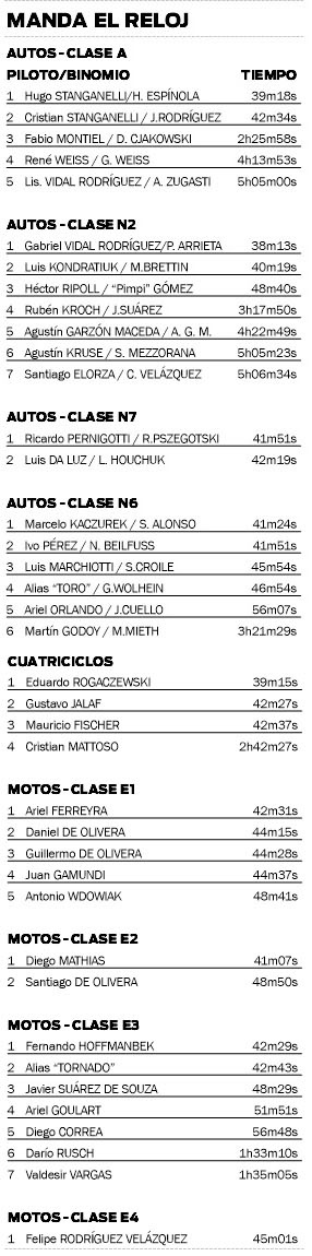 En el Grupo A, el de mayor potencia, la primera posición es sostenida por el mítico Hugo “Mono” Stanganelli, seguido de cerca por su propio hijo, Cristian, a poco más de tres minutos. Tanto los autos, como los cuatris y las motos le pondrán hoy nuevamente picante a los caminos de la costa del río Uruguay, desde las 9.20, cuando se ponga en marcha la segunda etapa de la competencia.