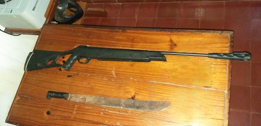 Con un rifle y un machete, la obligó a descender frente al inmueble, cuyo propietario no se hallaba en el lugar, y comenzó a romper la puerta a machetazos. Los gritos de auxilio de la joven alertaron a otros vecinos y se acercaron móviles policiales de las localidades mencionadas. El irascible no desistía de su intención de que se presentara el hombre que aseguraba que era amante de su concubina.