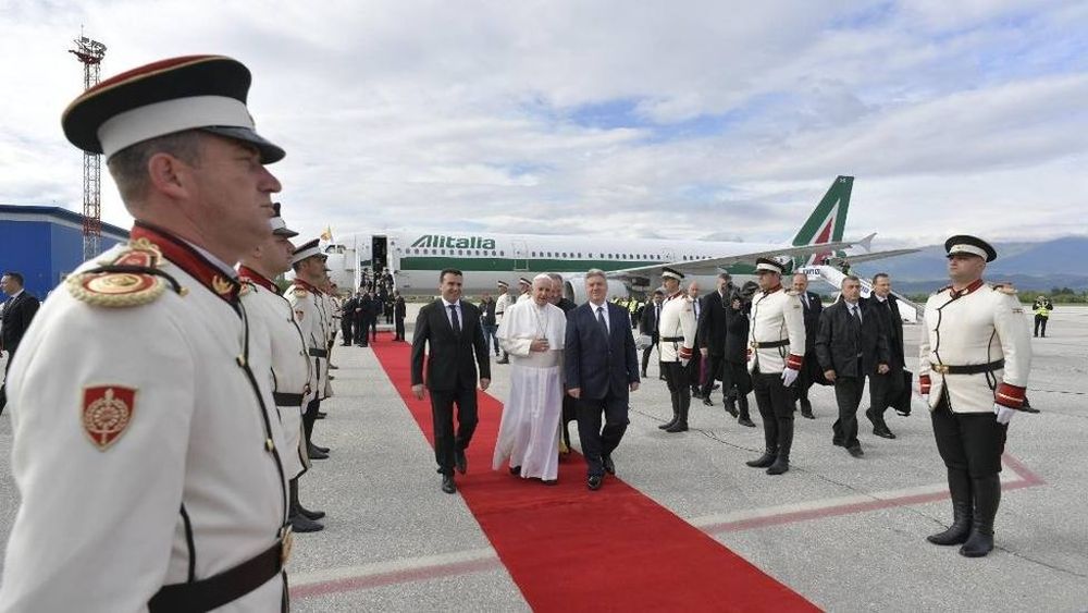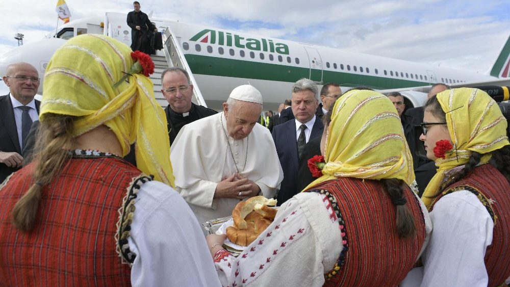 El avión del papa Francisco llegó a las 08.15 (3.15 de Argentina) al aeropuerto de Skopje -la capital del país, cubierta de fotos del sumo pontífice sonriente- donde fue recibido por el presidente Gjorge Ivanov y el primer ministro Zoran Zaev.