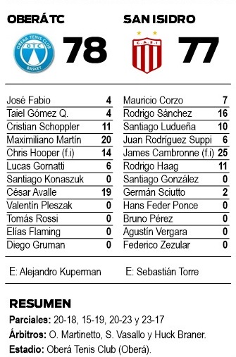 La actitud y el sacrificio que tuvo Oberá Tenis Club en el final fue determinante para llevar la serie a un cuarto partido . Se impuso por 78-77 a San Isidro de Córdoba, a dos segundos del final, y mañana buscará igualar el marcador.