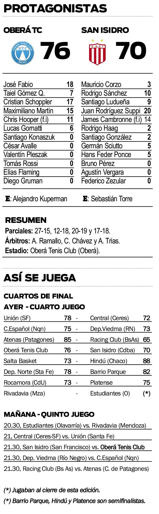 Con una nueva muestra de carácter y mucho sacrificio, Oberá Tenis Club derrotó por 76-70 a San Isidro de San Francisco y de este modo el pase a semifinales de la Liga Argentina de Básquetbol se definirá en un quinto partido que tendrá lugar este domingo, en Córdoba.