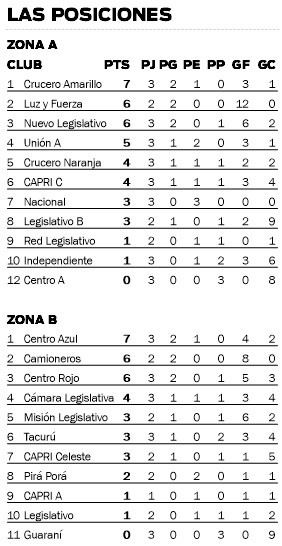 En Legislativo se jugaron cinco matchs. Por la Zona A, Nacional y Red Legislativo abrieron la jornada con un 0-0. Luego dieron paso al festival de goles, que llegó de la mano de Misión Legislativo que le metió cinco a Guaraní y sumó de a tres por primera vez en la Zona B. También por la B, Cámara Legislativo le ganó 2-0 a Tacurú. Entrada la tarde, por la Zona A, CAPRI C cayó ante Nuevo Legislativo por 3-0 y las últimas campeonas, Luz y Fuerza, cerraron la jornada con un 3-0 frente a Centro A.