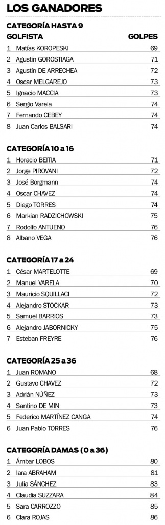 En la categoría 17 a 24 el ganador fue César Martelotte, que con los 69 golpes netos estuvo uno por encima de Manuel “Manolo” Varela, que con 70 se llevó el segundo premio.