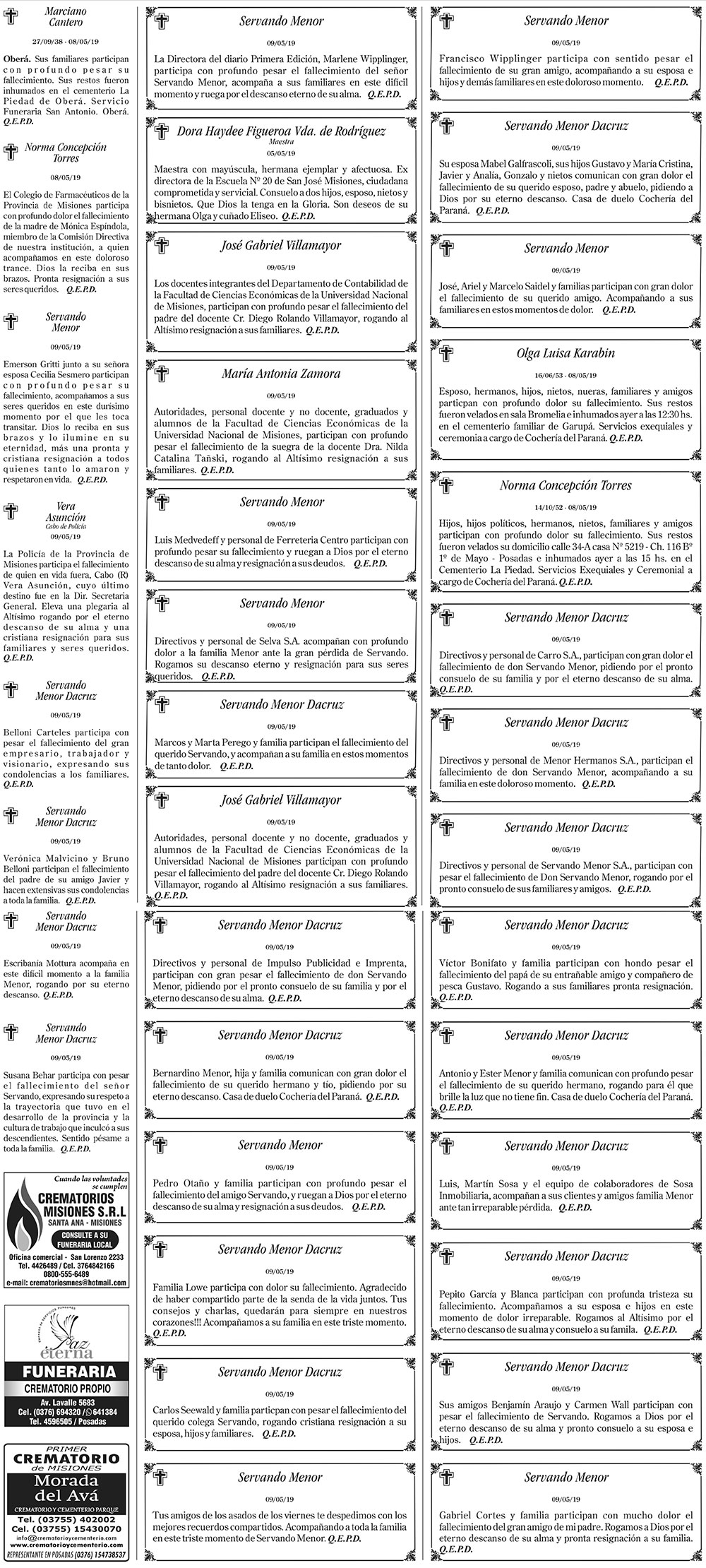 Fúnebres del viernes 10 de mayo de 2019