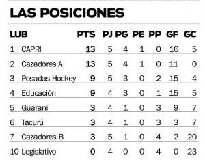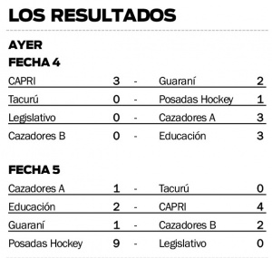 Entonces, por la mañana se jugaron los partidos de la quinta fecha y, por la tarde, los de la cuarta. Tras la doble jornada, CAPRI y Cazadores A se consolidan en lo más alto de la tabla con trece puntos, seguidas de cerca por Posadas Hockey y Educación, ambas con nueve unidades.
