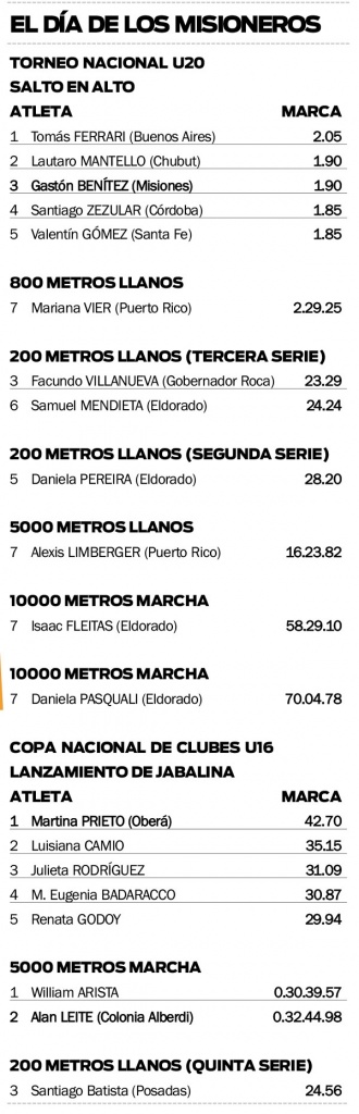 El oro llegó de la mano de Martina Prieto, en el Nacional de Clubes U-16. La joven de 15 años participó en la final de lanzamiento de jabalina y superó por lejos su mejor marca: con 42,70 dejó muy atrás el 41,94 conseguido el año pasado. Dicha marca le valió el lugar más alto del podio y otro oro para Misiones. “Fue una re linda experiencia, es la segunda vez que voy a esta pista. Me sorprendió el resultado, no pensé que iba a mejorar mi marca, pero tenía expectativas y me alegró mucho”, le dijo Martina a EL DEPORTIVO, con el oro colgado en el pecho.