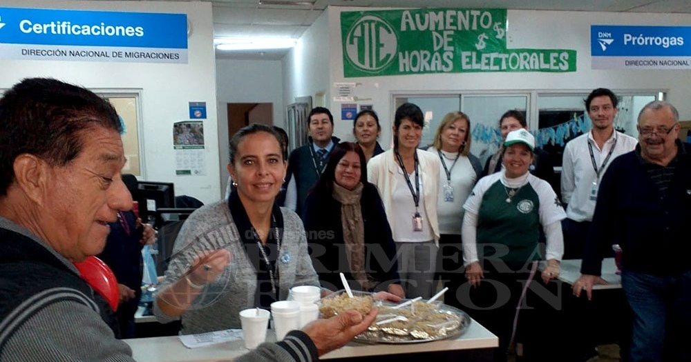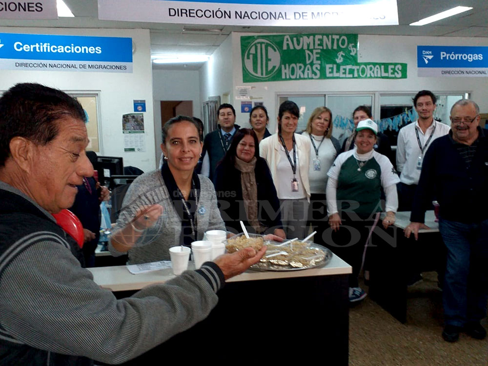 Los empleados de la Dirección Nacional de Migraciones, nucleados en ATE, de todas las sedes del país, llevaron adelante distintas medidas de fuerza. El reclamo central radica en la mejora salarial. En Posadas y tras una asamblea, se decidió atender al público en la delegación ubicada por Buenos Aires entre San Martín y Sarmiento. La particularidad, en este caso, fue que entregaba junto con el folleto donde se explicaba la protesta, una bandejita con reviro y un vaso con mate cocido a quienes se acercaban a realizar un trámite.