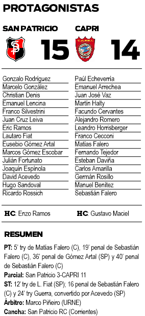 CAPRI estuvo otra vez ahí nomás de meter la primera victoria como visitante en el “Top 8” del Regional del Nordeste. Así como en su anterior visita a Corrientes había caído por 31 a 26 ante Taragüy en los minutos finales, ayer el “azzurro” perdió por uno (15-14) frente a San Patricio, luego de estar arriba en el marcador durante casi todo el desarrollo del partido.