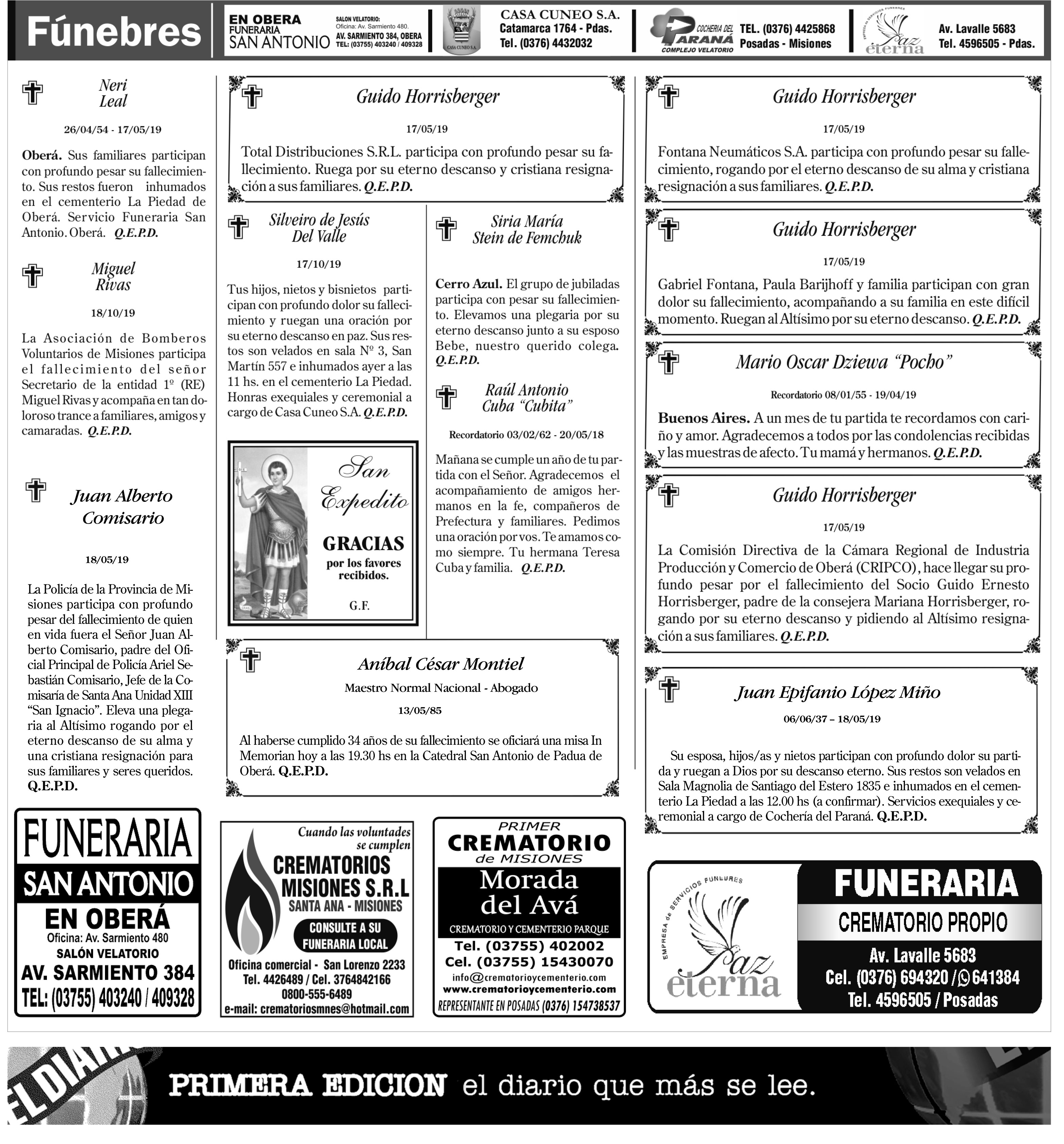 Fúnebres del domingo 19 de mayo de 2019