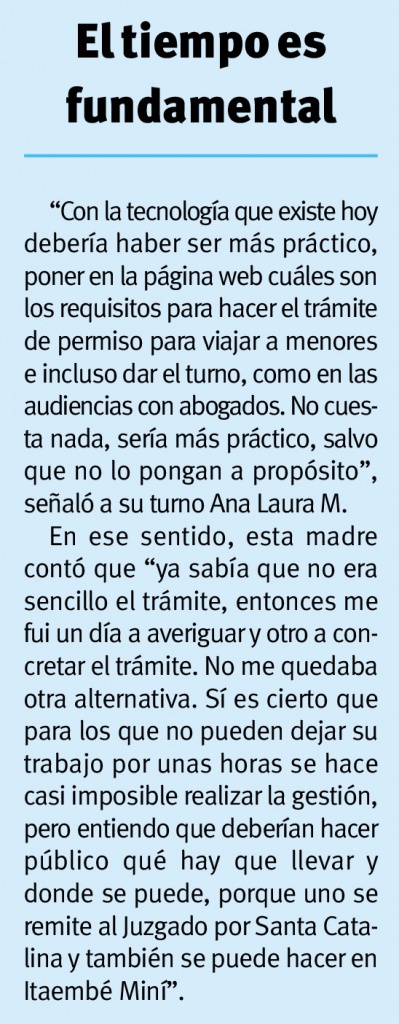 “A mi hijo no le querían dar el permiso porque soy mamá y papá a la vez pero me pedían que el padre firme. ¿Cómo voy a conseguir que el padre firme si no reconoce a mi hijo? Eso no querían entenderme, ni aceptar. Hablé con uno y con otro, incluso hasta salió una mujer que dijo que era la jueza pero no querían entenderme. Estuve desde las 6.30 de la mañana hasta casi el mediodía”, relató Ana G.