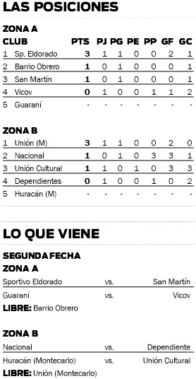 Por la misma Zona B, Unión de Montecarlo se hizo fuerte en su visita a Bernardo de Irigoyen, ya que superó por 2 a 0 a Dependiente FC.