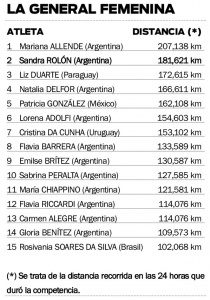 La “Negra”, como se la conoce en el ambiente del atletismo, mostró una resistencia formidable y un andar contundente por la pista del trazado internacional para completar 121 vueltas que equivalen a 181,5 kilómetros en 23 horas, 55 minutos y 42 segundos. Eso le valió el segundo puesto entre las mujeres, ni más ni menos.