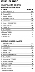 El gran vencedor de la jornada dominical fue Manuel González, quien se llevó por delante las pruebas en Pistola Calibre .22LR y Pistola Grueso Calibre. En la primera de las modalidades sumó 239 puntos, mientras que en la segunda alcanzó las 123 unidades, para alzarse con la clasificación general en ambas.
