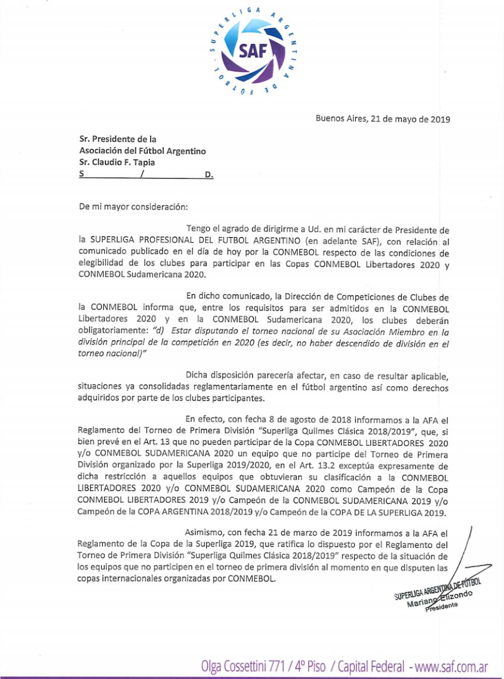 Desde la Superliga Argentina mandaron una carta a la Asociación del Fútbol Argentino (AFA), en donde indica que Tigre tiene “todo el derecho” de disputar la Copa Libertadores 2020, en caso de ser campeón.