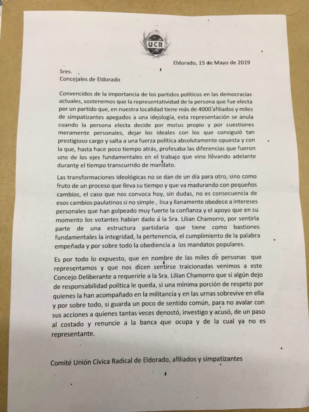 Durante la última sesión del Concejo Deliberante de Eldorado, se presentó formalmente una nota, exigiendo que la concejal Lilian Mabel Chamorro renuncie a su banca. La presentación fue realizada por el Comité de la Unión Cívica Radical de Eldorado, en nombre de afiliados y simpatizantes.