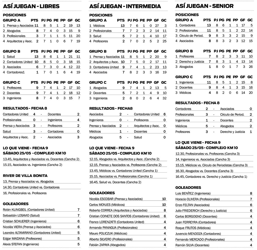 En tanto, en Intermedia, el mejor de todos es Médicos, también con 13 puntos, que sumó luego de derrotar en un duro partido a Docentes, por 1-0. Mauro Policzuk marcó el único tanto del partido, a los 11 minutos de juego. Después, todo fue aguantar para los profesionales de la salud, que así lo hicieron y el próximo finde chocarán contra Contadores United.