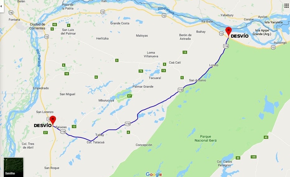 El tránsito pesado que se dirige con sentido Posadas a Corrientes será desviado por Ruta Nacional 118 en el Km. 1207, hasta empalmar con la Ruta 12 a la altura de Saladas.