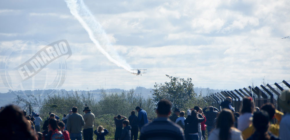 El sol asomó en plenitud cerca de las 11, mientras en las tribunas especialmente instaladas para la ocasión, el público, atendiendo las sugerencias del locutor del evento, se acomodó para observar las acrobacias aéreas del biplano llegado desde la ciudad de Salto, provincia de Buenos Aires, que realizó vuelos rasantes, dejando la estela de humo que dibujaba su arriesgada trayectoria.