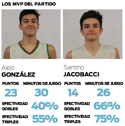 La figura del partido fue el capitán de la tierra colorada, Alejo González, quien jugó 30 minutos y marcó 23 puntos, con una efectividad en triples del 55%: metió 5 de los 9 que tiró. El player de El Coatí estuvo bien acompañado por Santino Jacobacci, quien marcó 14 puntos y fue segundo en la tabla de goleadores del match.