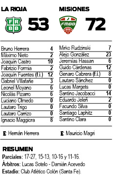El duelo de ayer ante los riojanos se disputó en el microestadio de Colón de Santa Fe, donde Misiones se mantuvo desde el comienzo en el marcador y logró vencer con 18 puntos de diferencia, por 72-53.