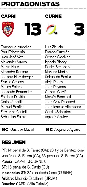 La gran concentración que tuvo en cada pelota fue vital para que CAPRI pudiera mantener la diferencia de diez tantos a favor, que incluso pudo haber sido mayor si Sebastián Falero no fallaba un par de penales en el complemento, aunque a favor del fullback hay que decir que las piernas, a esa altura, pesaban un montón.