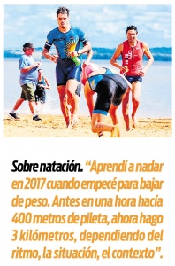 “La doctora Jessica Minadeo me pegó un tirón de orejas por los resultados de mis estudios y comencé a trabajar con una nutricionista. Empecé dieta y natación para ir bajando de peso”, cuenta. Para Semana Santa de 2017 lo visitó su hermano, Martín Kachuk, y le tiró la idea de comenzar triatlón. “Me pareció interesante y en mayo de 2017 cambié natación para bajar de peso a natación para competir, en vez de estar paseando en el agua, buscaba velocidad de a poco”.