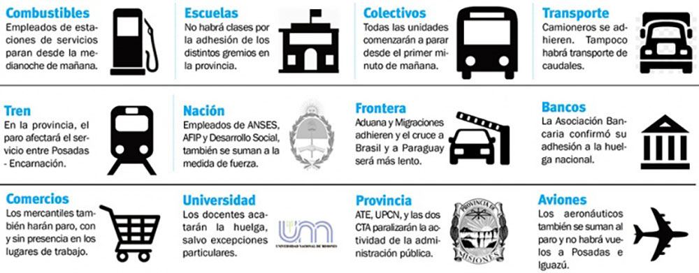“Tierra, agua y aire van a acatar esta medida de fuerza”, señaló ayer José Milcíades Giménez, secretario General de la CGT en Misiones. No habrá transporte público de ningún tipo: aviones, trenes, barcos ni colectivos. Además, la Unión de Kiosqueros del República Argentina (UKRA) confirmó que no cargarán la tarjeta SUBE para el transporte.