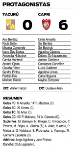 A los 8 llegó la apertura del marcador para CAPRI gracias a Cintia Amarilla tras un corto. Las Hormigas no acusaron el golpe y se lanzaron al ataque aunque no inquietaron el arco custodiado por Nayibe Zampaca. Antes de que termine el primer cuarto, Agustina Cáceres lideró el ataque y antes de entrar al área se la cedió a Patricia Maidana que remató y gol. 2-0 y al descanso. Gracias a la ventaja, CAPRI salió al segundo cuarto más tranquilo y le cedió la bocha a Tacurú, que generó algunas situaciones pero sin suerte. Para colmo, se le vino la noche porque, otra vez, segundos antes del final de segundo cuarto, Agostina Lloves, de revés, marcó el tercero.