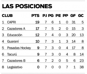La última del Apertura cerró ayer con otros tres partidos. Guaraní festejó frente a Posadas Hockey; Cazadores A se llevó el clásico ante Educación y el B cerró su participación con un 3-1 a Legislativo. Así las cosas, Cazadores A quedó segundo en la tabla y el podio lo completó Educación.
