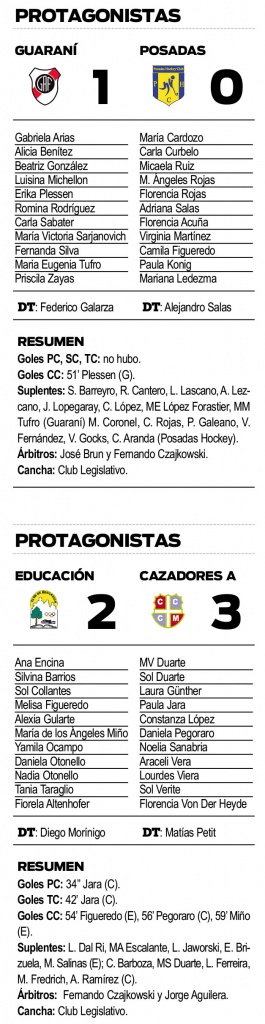 El más tempranero del domingo fue el encuentro entre Guaraní y Posadas Hockey. Las chicas de La Franja venían de empatar ante Centro A y Posadas Hockey quería volver a la senda del triunfo tras la derrota ante Educación la fecha pasada. Se jugó con el cuchillo entre los dientes y parecía que se encaminaba al empate hasta que a los 51 minutos, en el último cuarto, Erika Plessen marcó el único gol del partido y el triunfo para La Franja que cerró el Apertura en la cuarta posición. Posadas Hockey debió conformarse con el quinto lugar.