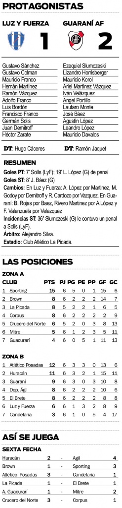 Con el partido que completaron en la jornada de ayer, en el que Guaraní Antonio Franco venció a Luz y Fuerza, se cerró la sexta fecha del torneo Apertura de la Liga Posadeña de Fútbol, que tiene como líderes a Sporting en la Zona A y Atlético Posadas en la Zona B.