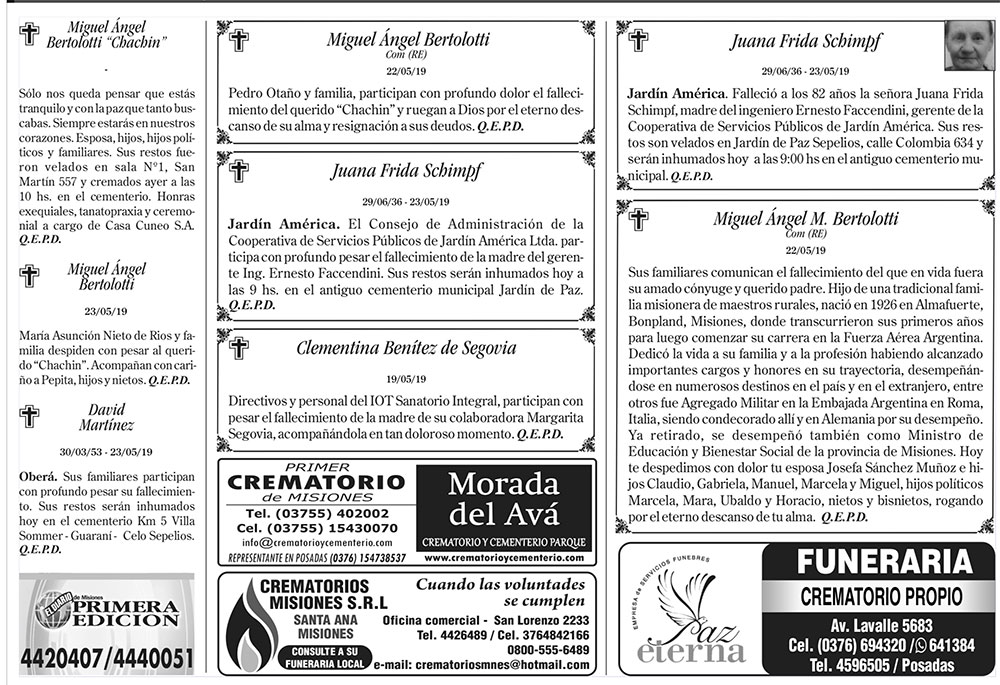 Fúnebres del viernes 24 de mayo de 2019
