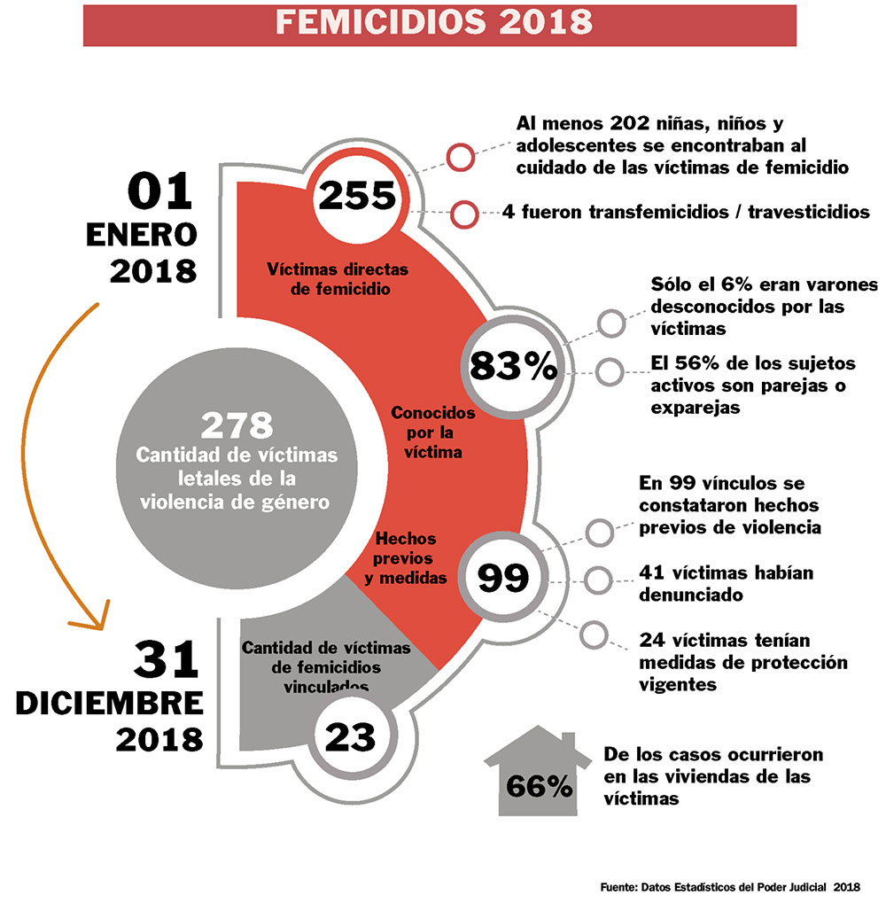 Un total de 255 femicidios y travesticidios y 23 femicidios vinculados se produjeron durante 2018, es decir 278 fueron las víctimas mortales a causa de la violencia de género, según el informe de la Corte Suprema dado a conocer este viernes basado en las causas judiciales de las 24 jurisdicciones del país en las que se investigan muertes violentas de mujeres cis, mujeres trans y travestis por razones de género, con independencia de la calificación legal asignada al momento de la carga de datos.