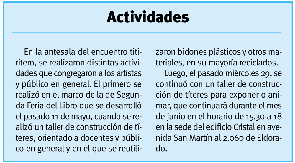 Cabe destacar que este encuentro artístico internacional trascendió generaciones y forma parte del calendario cultural de Eldorado y de Misiones. “Algunas personas se acercan y me dicen que disfrutaron de los títeres en su niñez y que ahora quieren que sus hijos también sientan esa misma alegría”, confió Holz.