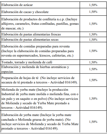 Transporte, construcción, té, yerba, preparación de frutas y hortalizas, aceites vegetales, elaboración de lácteos, de productos de molinería y almidón, alimenticios excepto pan común o galleta (exento), elaboración de hilados o textiles, fabricación de artículos de marroquinería y talabartería, calzado, aserrado y cepillado en madera, fabricación de productos de madera, fabricación de sustancias químicas básicas, fabricación de productos farmacéuticos, sustancias químicas medicinales, fabricación de vidrio y productos de vidrio, fabricación de productos minerales no metálicos, industrias básicas de hierro y acero, fundición de metales, productos primarios de metales preciosos y no ferrosos, fabricación de componentes electrónicos y productos informáticos, equipos médicos y quirúrgicos, motores, pilas, baterías, lámparas eléctricas, vehículos, maquinaria y equipo de uso especial, carrocerías, embarcaciones, aeronaves, transporte, artículos de deporte, juegos y juguetes.
