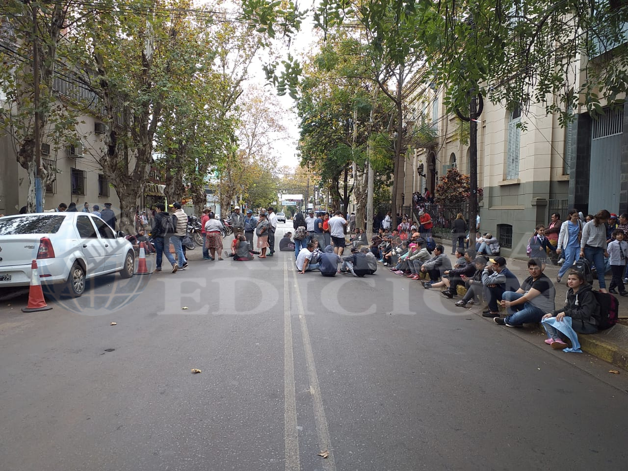 Un grupo interrumpe el tránsito en calle San Martín esquina Buenos Aires; otro se encuentra apostado en calle Buenos Aires en la entrada al estacionamiento interno de Gobernación, entre calle Bolívar y San Martín.