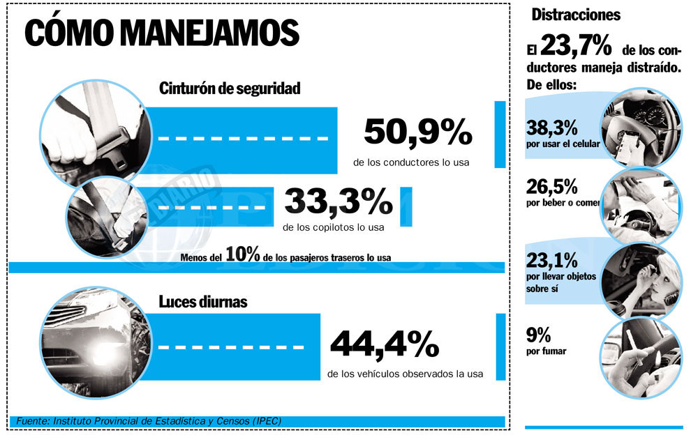 Sólo la mitad de los conductores y un tercio de los acompañantes usan cinturón de seguridad; uno de cada cuatro maneja distraído por algún motivo; y menos de la mitad de los autos van con sus luces reglamentarias prendidas durante el día. Estas son algunas de las preocupantes conclusiones que se pueden extraer de los dos primeros informes -de un total de cinco previstos- emitidos por el Instituto Provincial de Estadística y Censos (IPEC) tras procesar los datos recolectados en un trabajo conjunto con el Observatorio Vial de la Municipalidad capitalina para conocer cómo se maneja y cómo se percibe el tránsito en la ciudad.