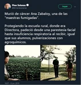 Hace no mucho tiempo, Zabaloy publicó una carta abierta en la que pidió a las autoridades políticas y a las empresas fumigadoras que paren de matar a la gente. “Paren de matarnos. Paren de fumigarnos”, finalizó entonces su texto.