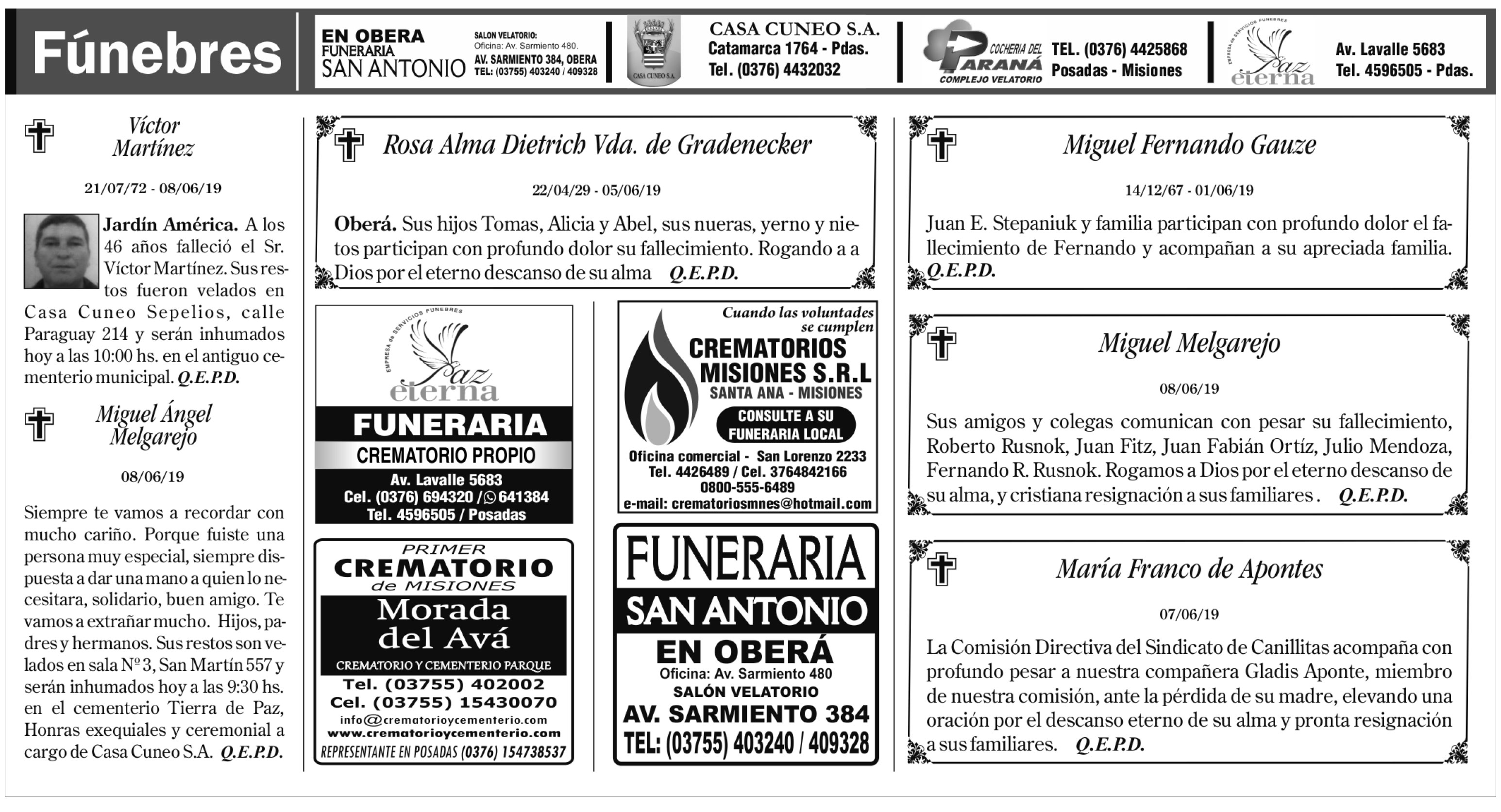 Fúnebres del lunes 10 de junio de 2019