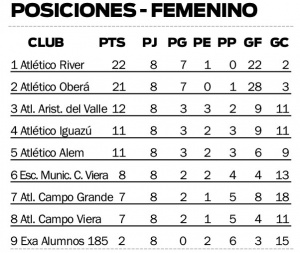 Por su parte, Atlético Oberá goleó a la Escuela Municipal de Campo Viera con goles de Meli Núñez, Loli Krczeckowski y Eugenia Gismondi.