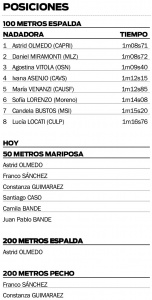 Hoy será otra día de acción y además de Astrid, también competirán Franco Sánchez, Constanza Guimaraez, Santiago Caso, Camila y Juan Pablo Bande en los 50 mariposa; mientras que en los 200 pecho también estarán Franco Sánchez y Constanza Guimaraez. A la mañana fueron las eliminatorias y esta tarde las finales.