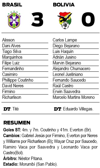 Parecía que el gol de los anfitriones estaba al caer, pero los bolivianos, totalmente replegados, les generaron varios dolores de cabeza a un equipo que le faltó un generador natural de juego, como Neymar, para romper líneas.
