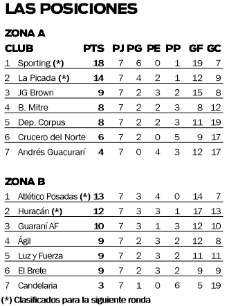 Huracán, que también está en cuartos de final, enfrentará a Crucero del Norte que cuenta con remotas chances, mientras que El Brete y la Picada se medirán en San Isidro. En Santo Pipó, en tanto, Sporting, con su lugar asegurado, irá con el eliminado Candelaria.