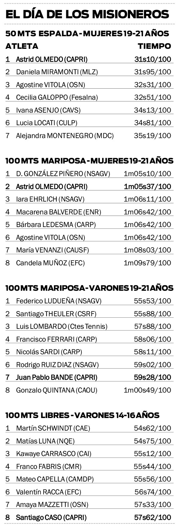 “Pude bajar mis marcas. En 100 mariposa bajé dos segundos y en los 50 mariposa pude volver al rango de los 28 segundos”. Si bien Astrid se preparó para esta competencia desde principio de año, aseguró que “lo que pasó este último día no me lo esperaba para nada”.