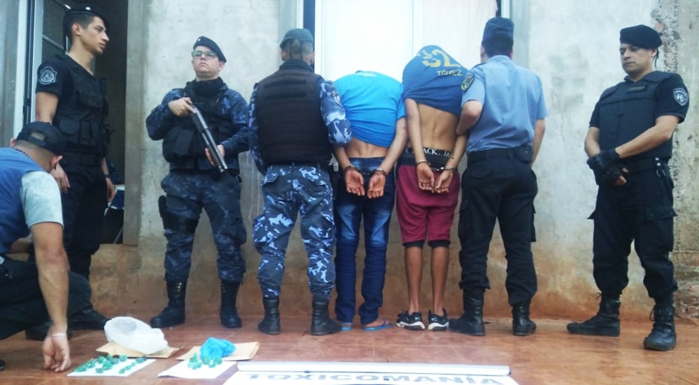 El allanamiento y las detenciones se produjeron este lunes en un domicilio de la calle Sapucay de la ciudad de Oberá, cuando efectivos de la División de Toxicomanía UR II, detuvieron a Hugo B. de 27 años y Marcos C. de 19, ambos con pedido de detención por hechos de robo y robo calificado. En el lugar secuestraron cuchillos, 28 envoltorios de marihuana, 2 balanzas de precisión, 1 teléfono celular y gran cantidad de insumos.